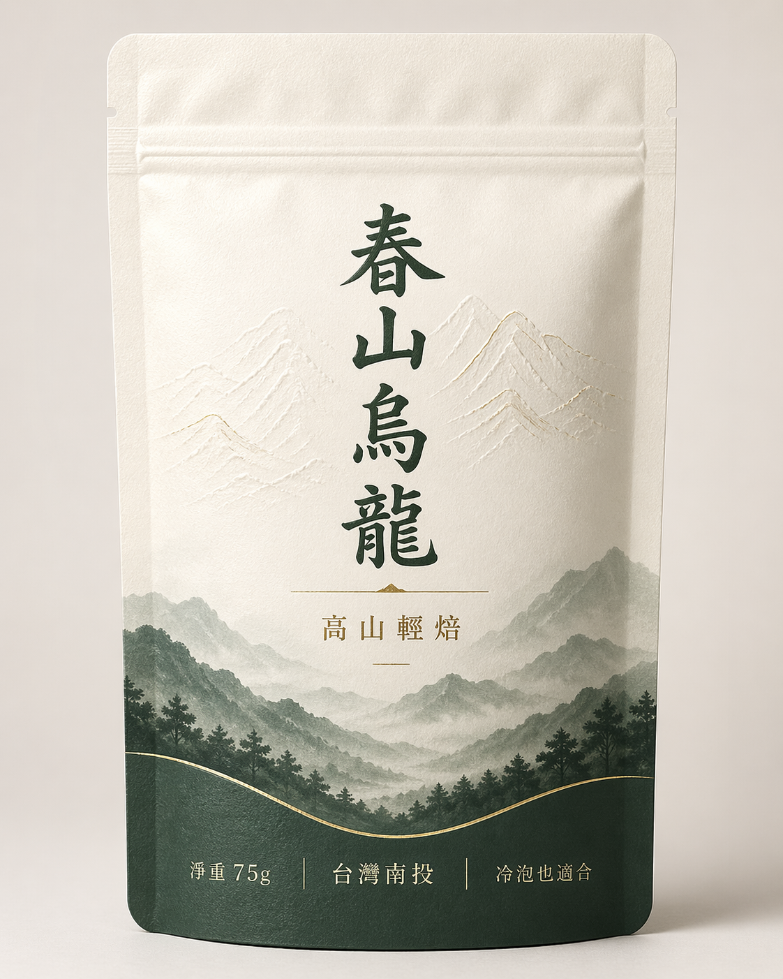 指定文字(春山烏龍、高山輕焙、淨重 75g、台灣南投、冷泡也適合)全部正確、沒有簡體混入。