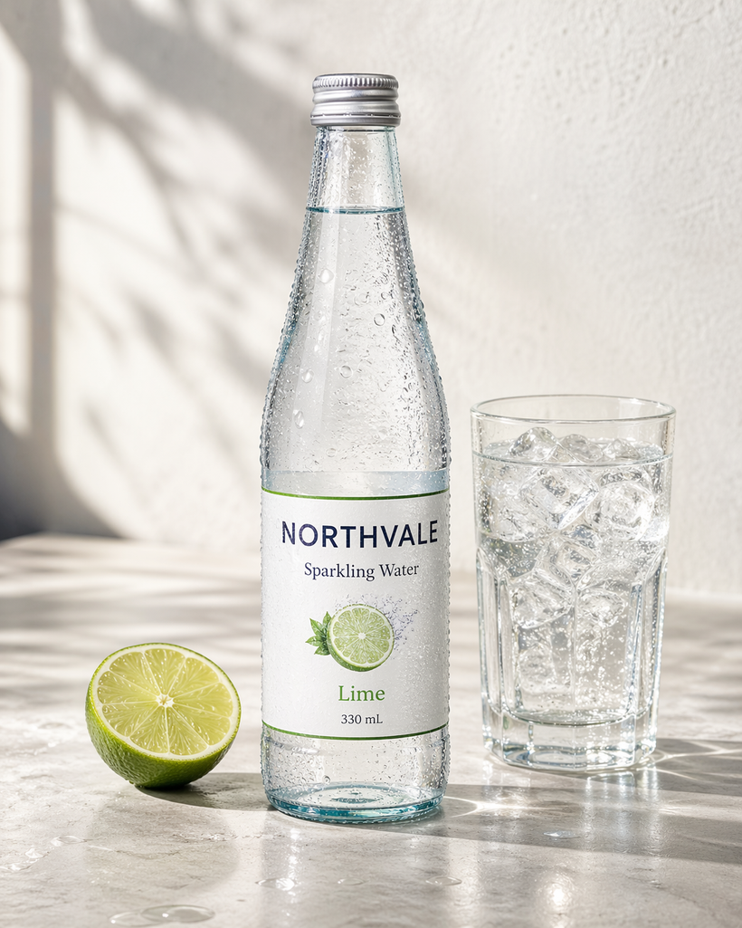 「NORTHVALE / Sparkling Water / Lime / 330 mL」清楚可讀、沒有拼錯。