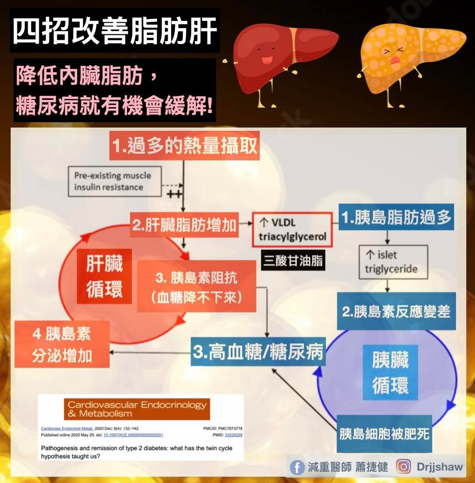 以往我們認為,糖尿病是由於長期高血糖造成胰島細胞的損傷,而2020發表在 Cardiiovascular Endocrinology & Metabolism這篇文獻告訴我們:「脂肪對胰臟是有毒性的,逆轉糖尿病的關鍵就在於肝臟和胰腺內脂肪的減少。」