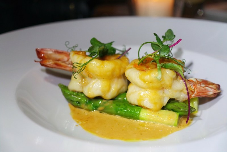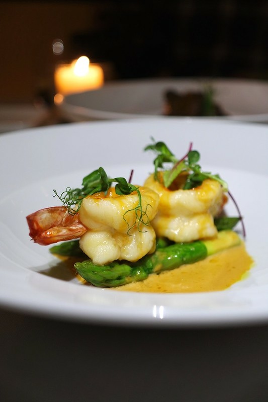 ▲爐烤虎斑明蝦佐白龍蝦醬汁/橘子油拌綠蘆筍 (2800套餐)