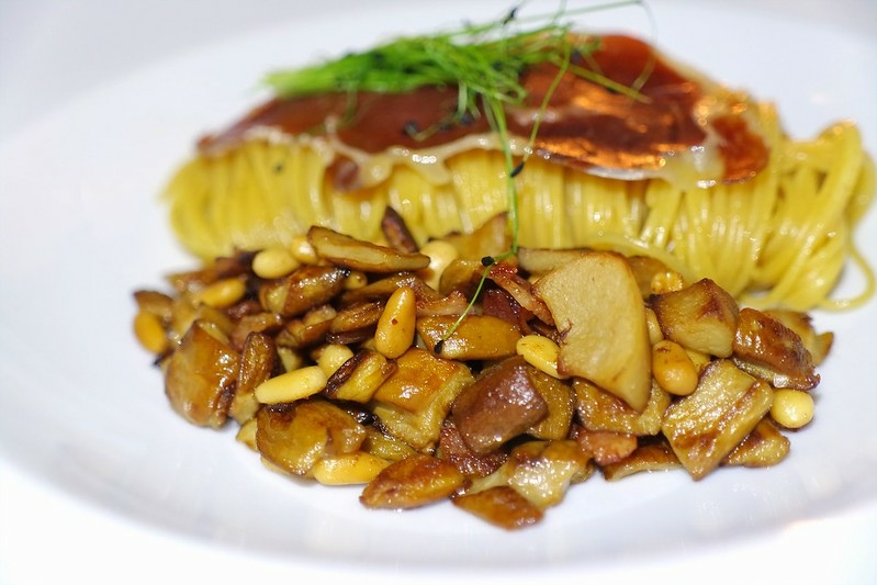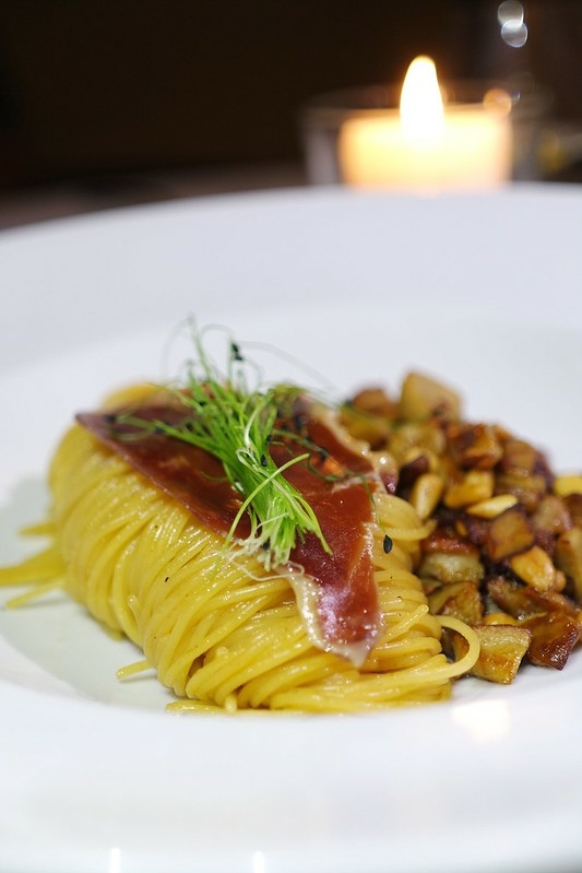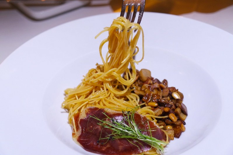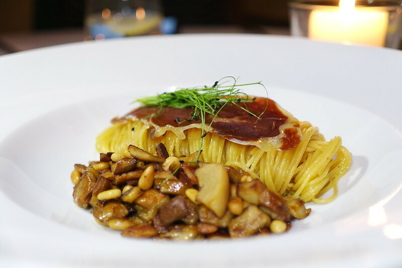 ▲杏仁油松子燻肉炒牛肝菌/香草油火腿肉汁炒細義大利麵襯依比利火腿 (單點)