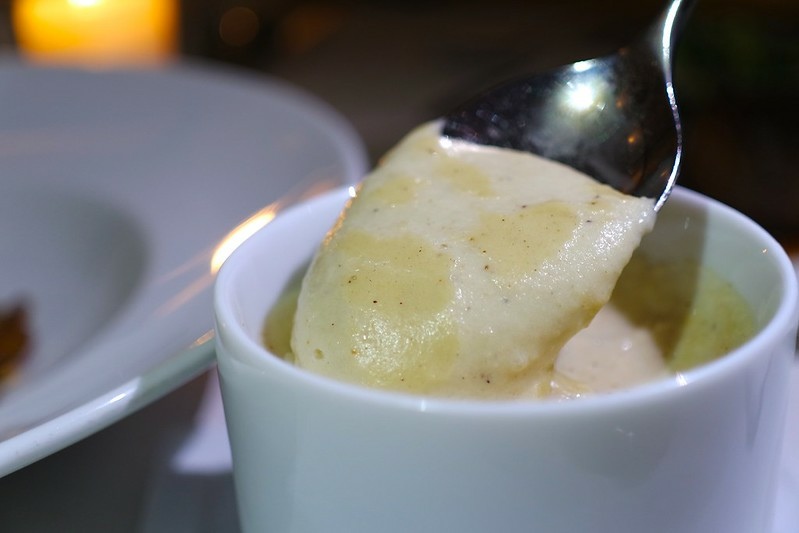 先是濃稠口感,再來被覆盆子的酸味化解成較清新的口味,是一道富有層次的美味甜點