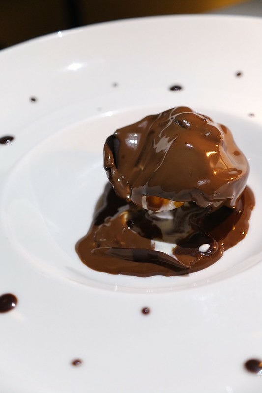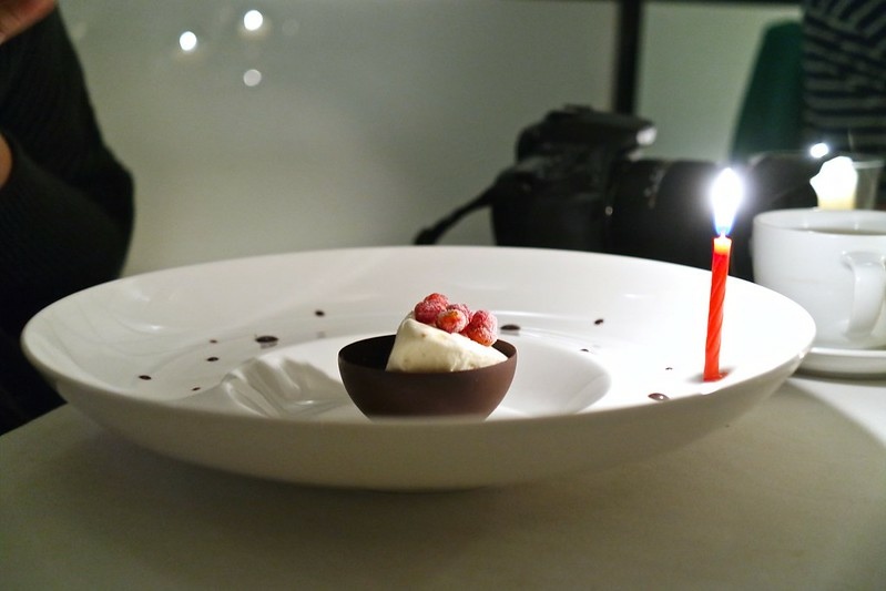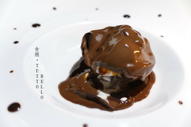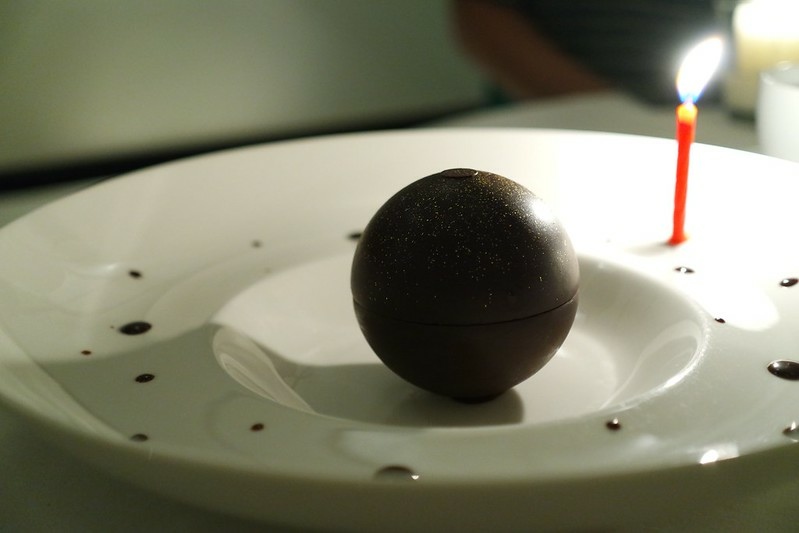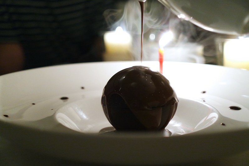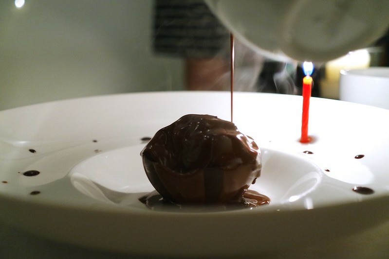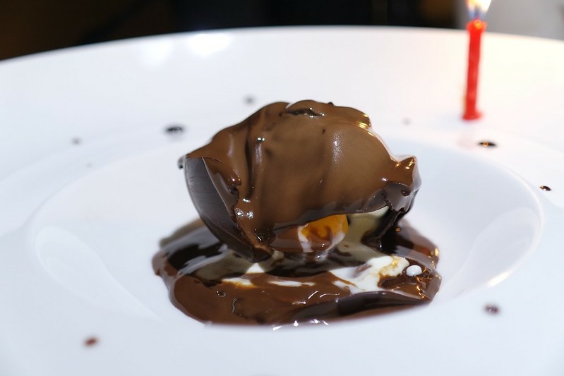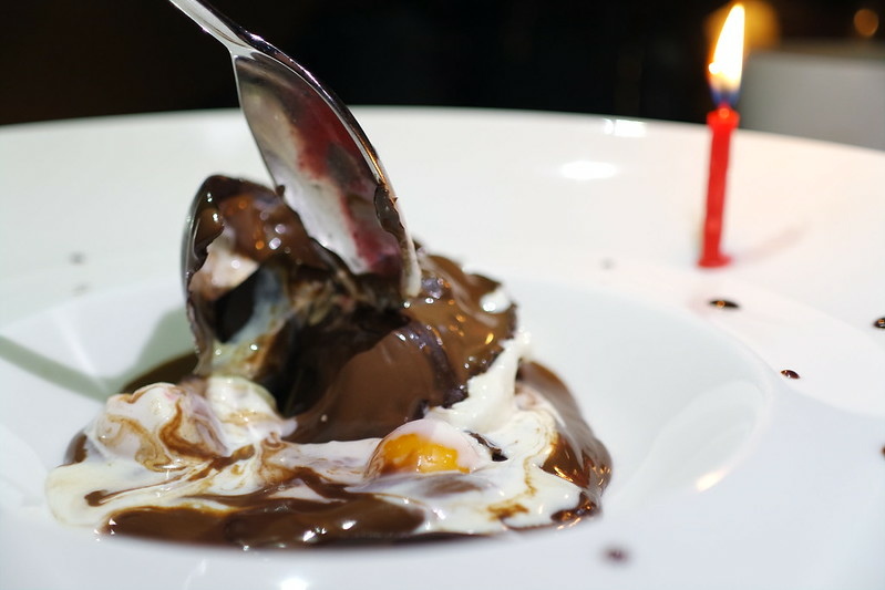 結果因為我們這回來用餐是為了慶生,所以服務人員就直接將生日招待甜點換成驚奇巧克力給我們享用了!(灑花~)
