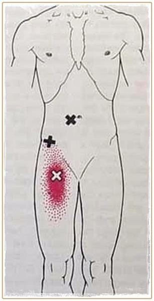 1.大腿前側靠近恥骨的地方緊繃。(如下圖紅色標示處)。