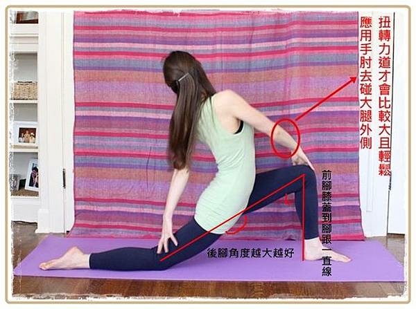 另外一個重點是前手肘應該要放到前腿外側去,可以利用手的力道加強扭轉的效果,髂腰肌的感受度會更強。