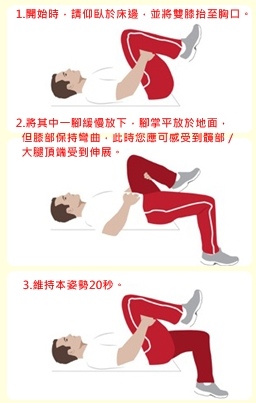 髂腰肌伸展動作4:躺在床沿抱膝伸展(圖片及動作詳解點此)