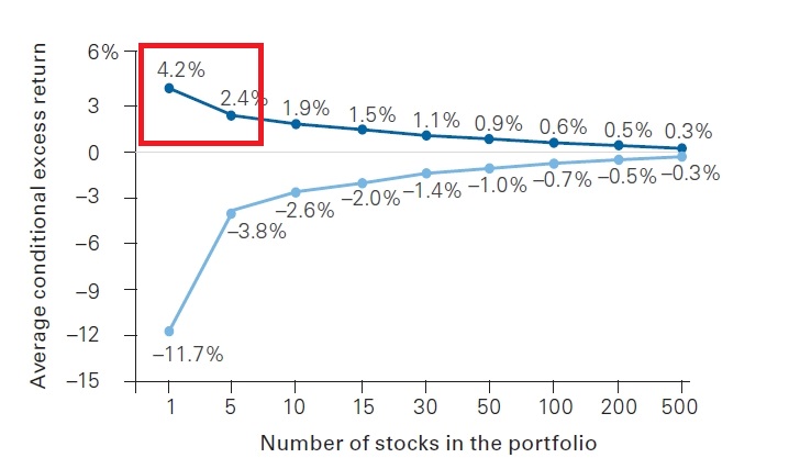 就是這種想要藉少數機會賺一大筆的心態,驅使很多人做高度集中的投資,投資只買幾支股票。