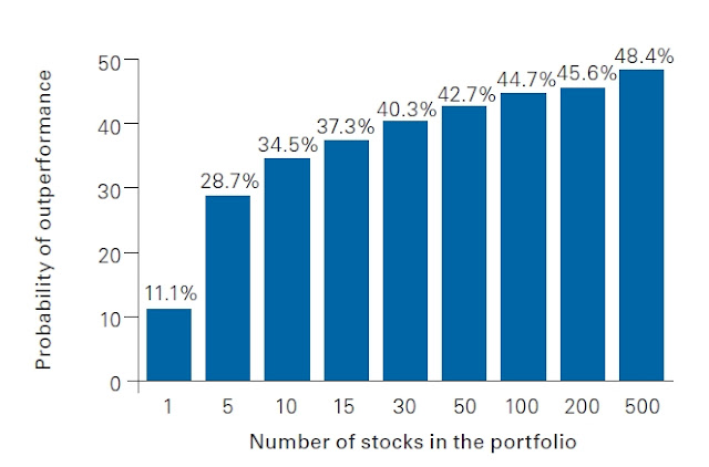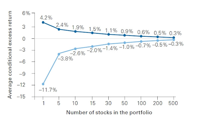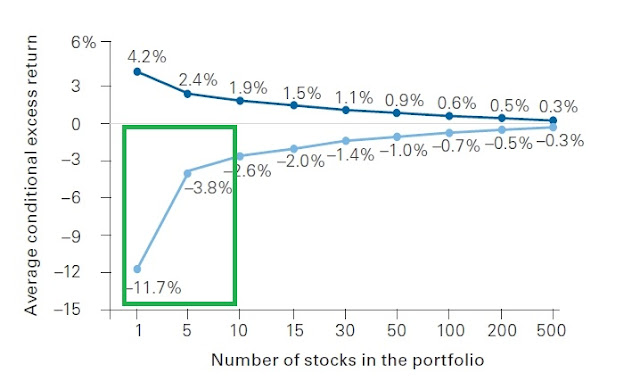 譬如持股數1支的投資組合。它勝過指標時,平均只贏4.2%。但落後時,平均落後11.7%。這是贏小輸大。而且還是贏的機會比較低。
