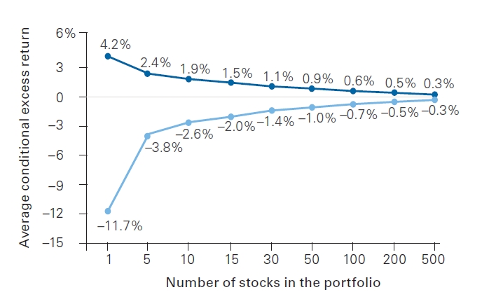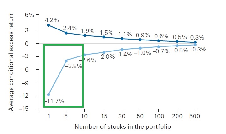 每一個持股支數的投資組合有兩個超額報酬率數字,一個高,一個低。