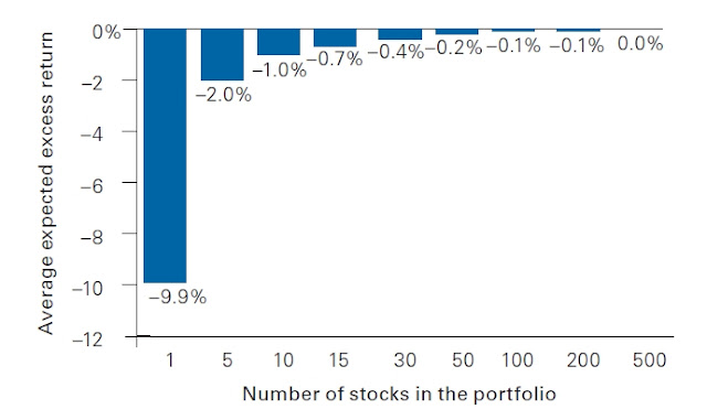 所以總結來說,持股數1支的投資組合,它的預期超額報酬(Expected excess return)=11.1%*4.2%+88.9%*(-11.%)=-9.9%。