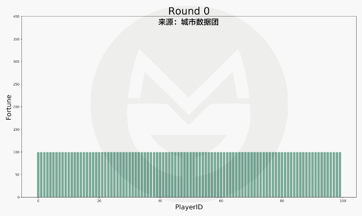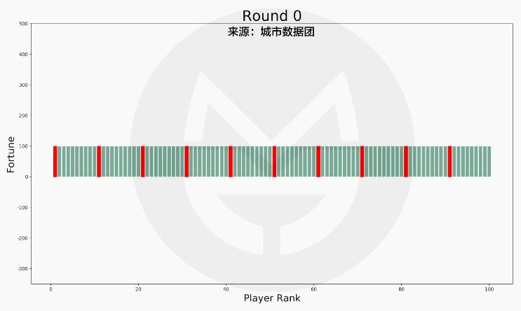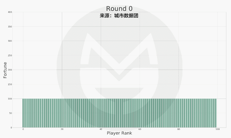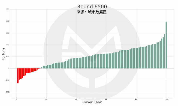 (說明:上圖中橫軸標籤代表玩家排序(非編號),排序越高的財富越多。初始時所有人的財富值相等,隨著遊戲的進行,財富值差距越來越大。)