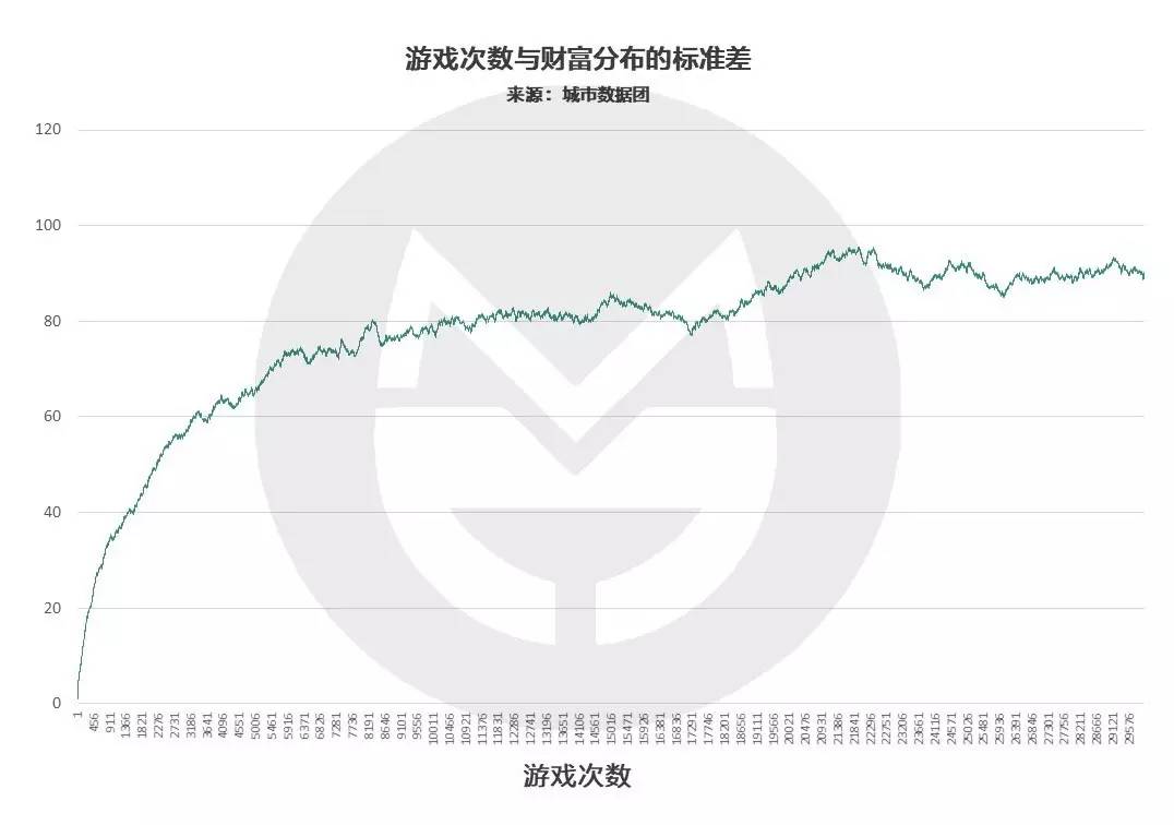 我們以所有玩家財富值的標準差來衡量社會貧富分化程度,按時間序列做出圖來長這樣: