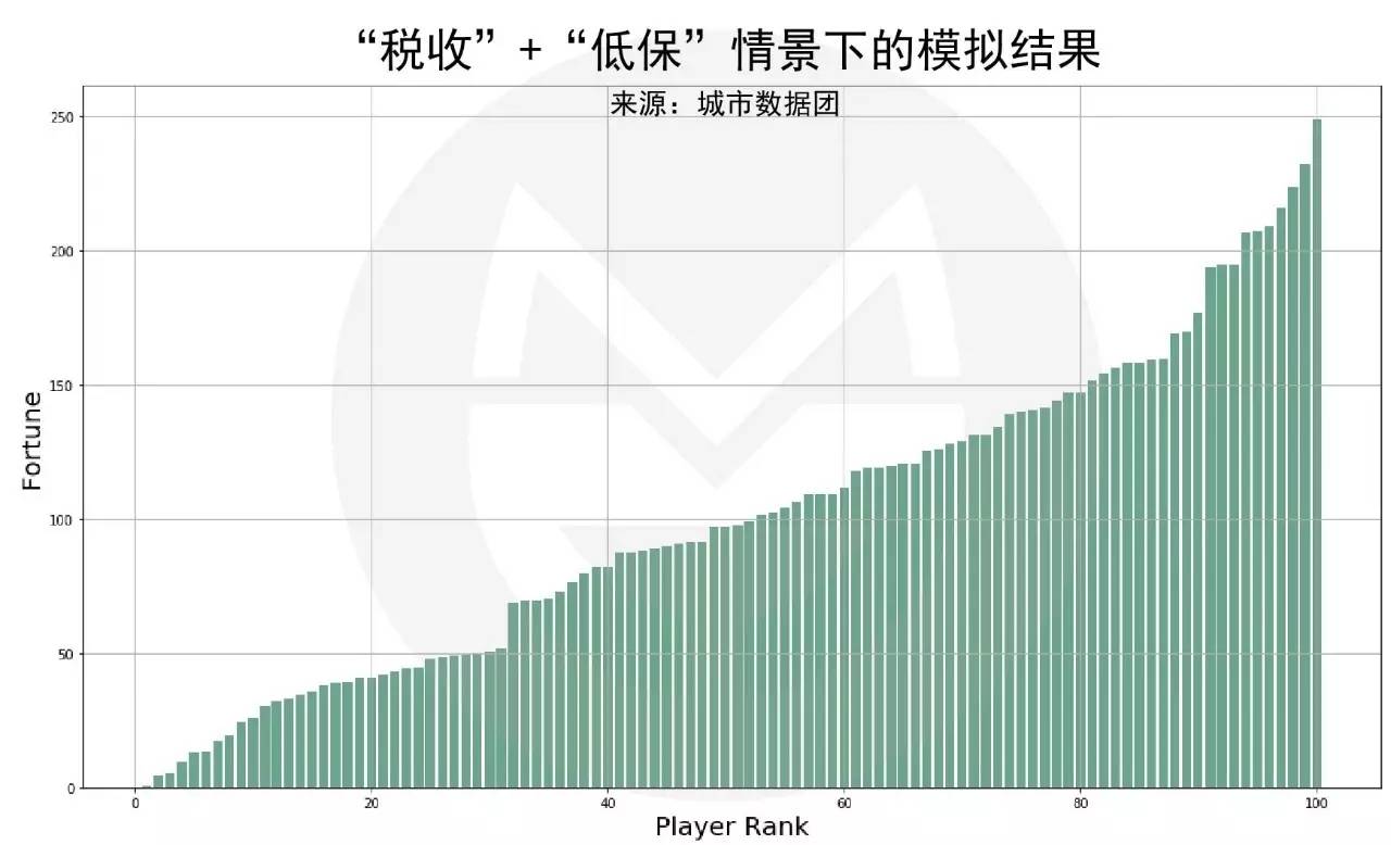 可以看到,在“稅收+低保”的遊戲規則下,社會財富分佈仍然是高度極化的,區別只是基本消滅了破產者,同時富有的人沒那麼富了而已。