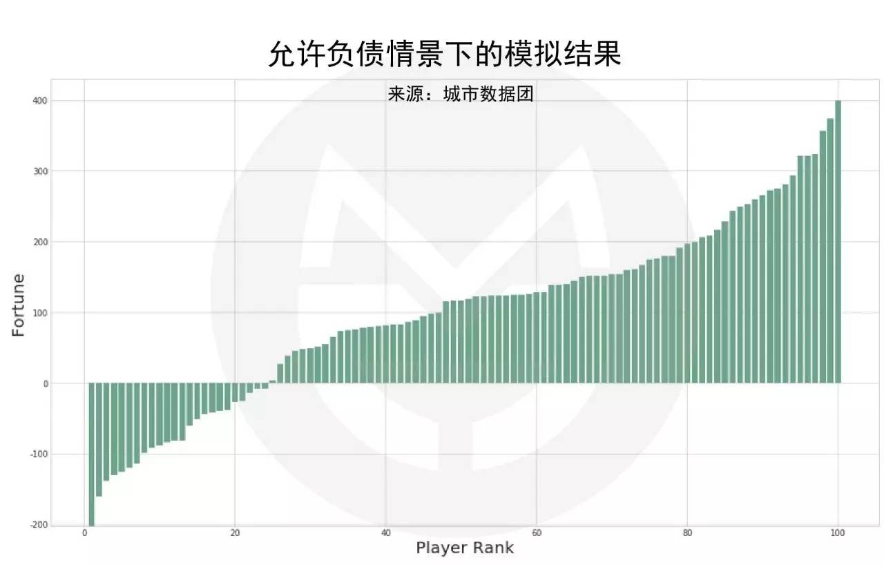 在現實社會中,情境會更複雜一些。比如說,當我們沒錢了,還可以找親友、找銀行、找投資人借債,說不定哪天就東山再起了呢。在允許借債的情況下,遊戲結果如下圖所示(排序後結果):