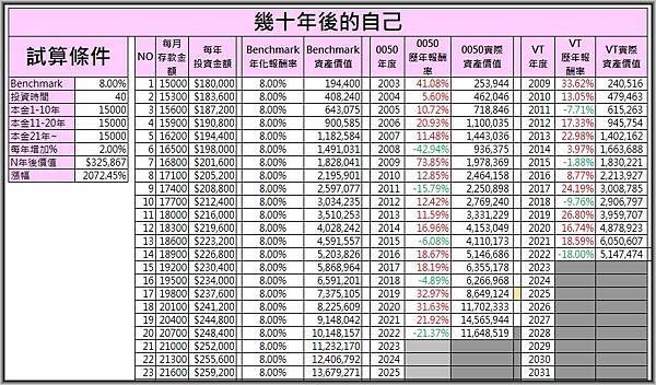 下圖是一個簡單的定期定額試算,分別使用0050與VT為投資標的。報酬率是這兩檔ETF的歷年報酬率。如果你每月可以定期定額15000元,分別投資在0050或VT目前會有多少資產。