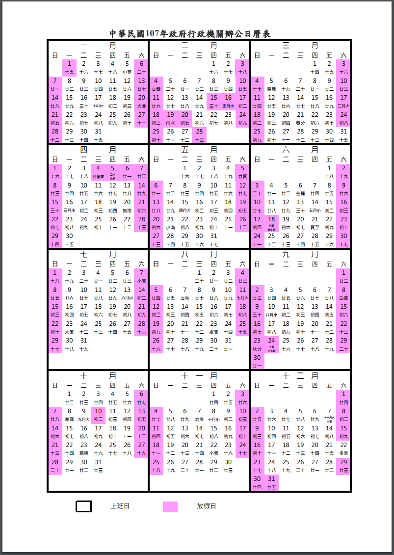 2018年(中華民國107年)政府辦公行事曆新聞稿