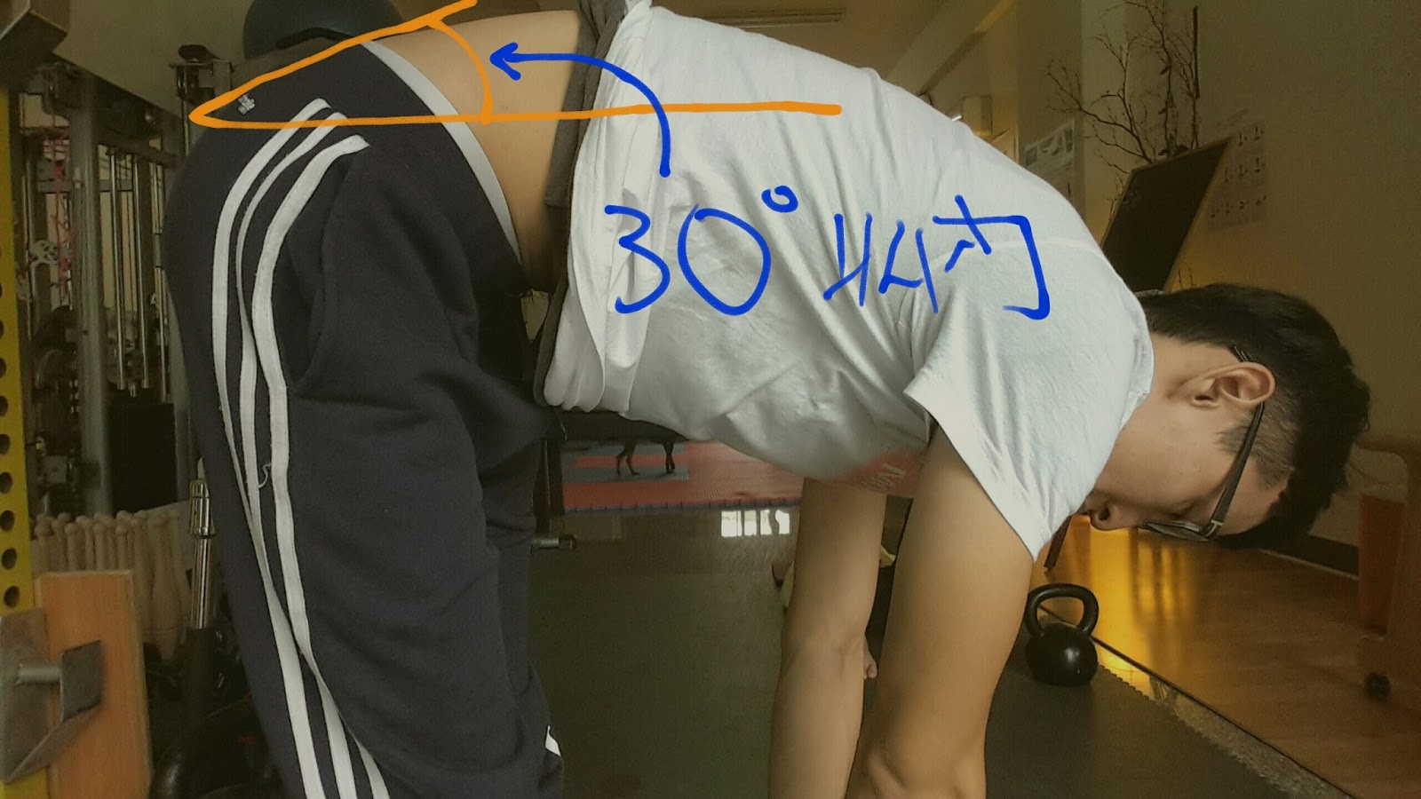 結果2. 無法碰觸腳趾,無法正常自然深層呼吸,薦椎夾角30度以上。
