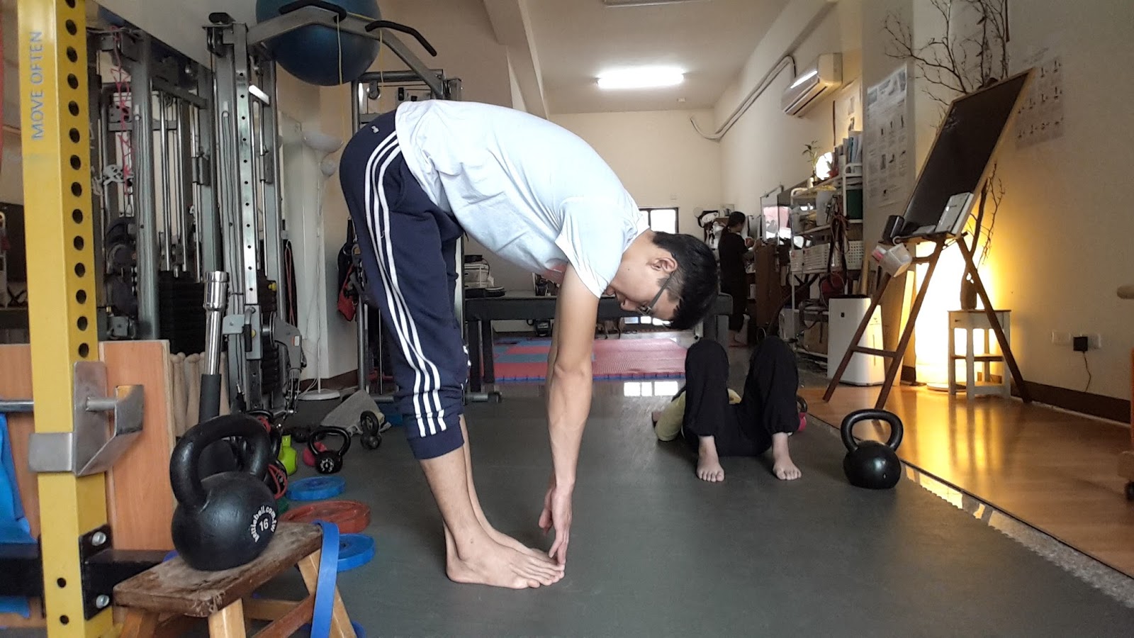 結果1. 可以輕鬆模住腳趾並完成三次深度腹式呼吸,同時薦椎與水平面夾角30度以內。