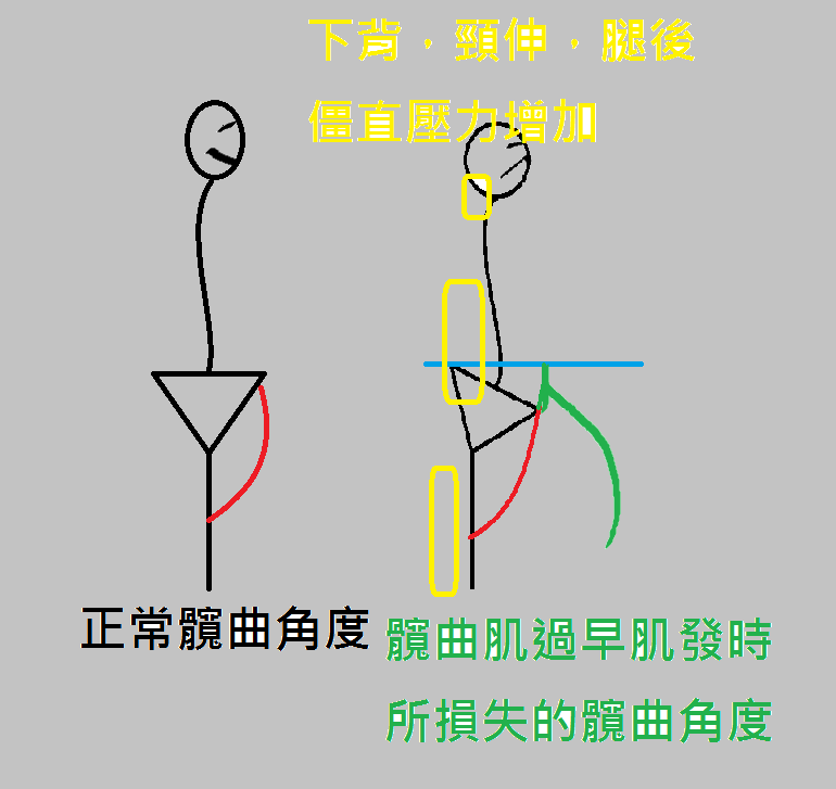 代表身體條件2. A: 髖關節功能異常,肌肉激發順序上,髖曲肌激發太快,導致還未下彎骨盆已前傾,限制腹內壓的產生,同時減少髖曲的角度,下彎階段由於核心不穩腹內外斜與下背過度參與緊繃,不足的髖曲角度由脊椎曲取代,也增加了頸伸肌的代償。
