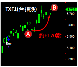 再回頭來看看台指期這兩周的走勢(如下圖所示),這段時間一共漲了約170點左右,如果我有60萬,使用程式留倉策略,我滿倉只敢下到2口大台,假設我這段期間下2口多單,漲170點,總獲利為170×200×2=+68,000元。