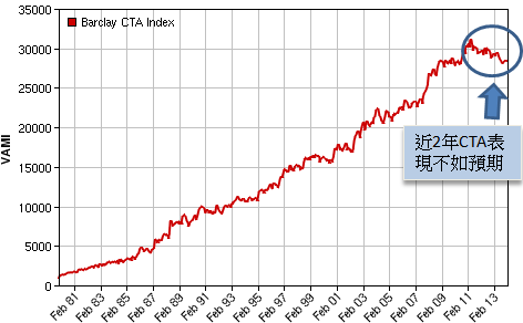 美國Barclay CTA index紀錄美國CTA的平均績效表現,2012及2013年指數呈現持平回檔狀態,但是同期的股票型基金都不斷創新高,主要的原因是因為全球成交量大的主要市場振幅都變小,不管是順勢或是逆勢策略的獲利都被壓縮。我給各位讀者的建議是,把現貨加入你的投資組合裡面搭配你的期貨部位進行平衡避險,很容易就可以打敗美國這些CTA操盤手了(因為他們只會做期貨,卻忘了投資效率)。